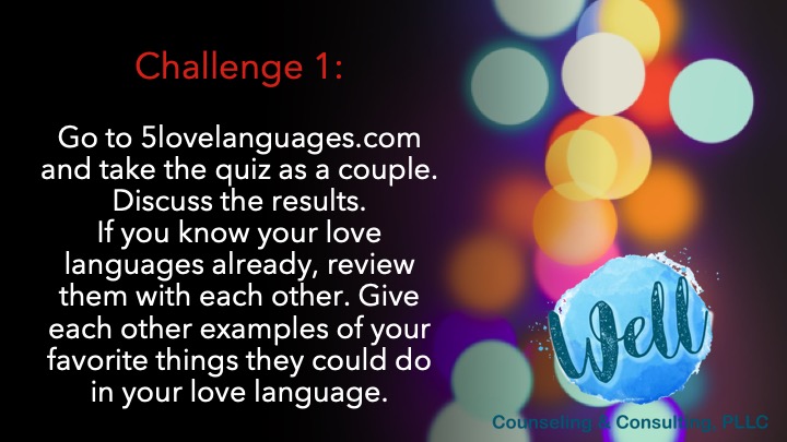 Challenge 1 Posted bysydneylucasFebruary 5, 2020February 3, 2020Posted inUncategorizedTags:5 love languages, challenge, couples counseling, marriage, valentines day Share this:More Click to email a link to a friend (Opens in new window) Email Click to print (Opens in new window) Print Like Loading... Related
